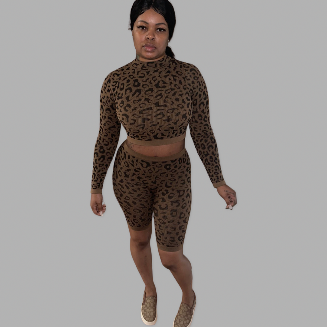 Seamless Animal Print long sleeve crop top and bike short set.